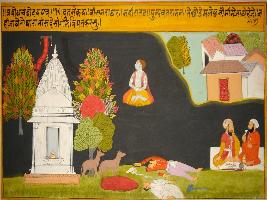 | Description / विवरण | Miniature painting based on Sanskrit drama - Prabodh Chandrodaya depicting a messenger telling about the death of two people in front of a temple and two scavengers and animals eating the dead bodies. |