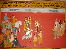 | Description / विवरण | Miniature painting based on Sanskrit drama - Prabodh Chandrodaya depicting Durga, Saraswati followed by the other Devtas. While five Vishnu worshippers are seen on the left side of the painting. |