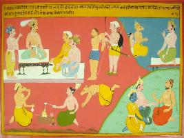 | Description / विवरण | Miniature painting based on Mahabharat - Rajdharma parva. The painting says about the duties of a king and narrate that of a king do all his duties according to the Rajdharma than he got place in heaven. |