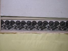 | Description / विवरण | This is a Nottingham machine made black silk chantilly lace. Flower and leaves pattern is depicted on a thin net. One edge is straight and the other edge is wavy. |