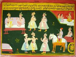 | Description / विवरण | Miniature painting based on Harivansha depicting two royal men seated on couch, then they are shown welcoming a king, arriving on a chariot, with folded hands and gifts. In the top left corner Indra is talking to two sages. |