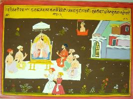 | Description / विवरण | Miniature painting based on Harivansha depicting Kaljavan seated in throne with courtesans on the right side of the painting, while on the left side a Gandharvas is sitting in a Vayuyaan. |