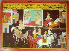 | Description / विवरण | Miniature painting based on Harivansha depicting two ladies talking to each other in a house, in the middle top four kings are talking to each other, in the top left a king is driving a chariot by himself. In the lower side two kings are sitting on horse and again in a chariot. |