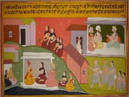 | Description / विवरण | Miniature painting based on Sanskrit drama - Prabodh Chandrodaya depicting Digambers moving to different provinces after crossing Sindhu river and going to Gandhara, Magadh, Kalinga, Panchal etc. |