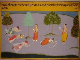 | Description / विवरण | Miniature painting based on Sanskrit drama Prabodh Chandrodaya depicting two warriors lying and a woman in between. A pundit asking something a woman and a Pundit lying with a bow and a arrow of a flower. |