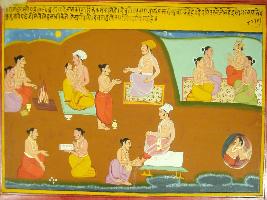 | Description / विवरण | Miniature painting based on Mahabharat - Rajdharma parva depicting Brahman is doing their own work, and Devtas expecting for heaven. It also depicts that Devtas achieve heaven after hard penance. |