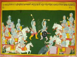 | Description / विवरण | Miniature painting based on Mahabharat - Shalya parva depicting Shalya is fighting and killing Pandavas army and son of Karna is fighting with Nakul. |
