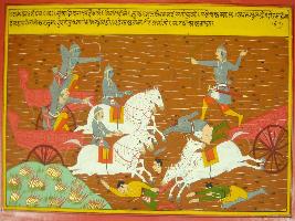 | Description / विवरण | Miniature painting based on Mahabharat - Shalya parva depicting Arjun looking as pure as fire and fighting vigorously with Ashwasthama. |