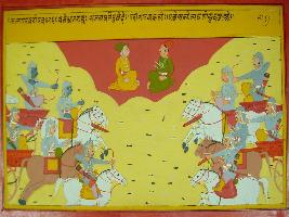 | Description / विवरण | Miniature painting based on Mahabharat - Shalya parva depicting Dhritrashtra is aking Sanjay about the war and Sanjay says that the war is going on vigorously in between Kauravas and Pandavas. |