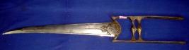 | Description / विवरण | Katar with slightly curved blade with grooves and U shaped handle with two bhogli. The handle has golden koft work but almost rubbed out. |