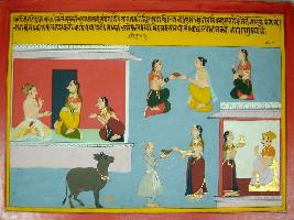 | Description / विवरण | Miniature painting based on Harivansha depicting a man giving advise to two women in his house at the right part. To their upper left, she is shown giving alms to a sage. At the upper left, she is shown sitting alone. At the middle left, she is shown giving a bowl to a person. At the lower left, she is shown serving her husband. |
