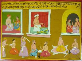 | Description / विवरण | Miniature painting based on Mahabharat - Rajdharma parva. On the upper part a couple is depicted sitting, one merchant with palace and a couple sitting in ashram. On the lower part rishis depicted talking and doing penance. One man is depicted making an assault to a Brahman. |