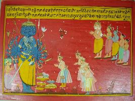 | Description / विवरण | Miniature painting based on Harivansha depicting the Vishva-roop of Vishnu, followed by Garuda, while Raja Bhishmak, Brahma, Indra and other Devtas are seen in namaskara mudra. |