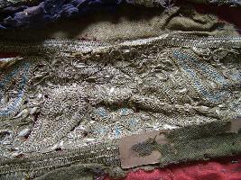 | Description / विवरण | Border traditionally called phuldar chorkari ki bel . Gold and silk embroidered on black ground with a five-leaf flower and four mangoes. |