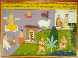 | Description / विवरण | Miniature painting based on Mahabharat - Rajdharma parva. Brahma is depicted asking two Brahmans toe perform yagna for the creation of animal plant, human, medicines. |
