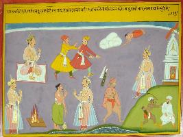 | Description / विवरण | Miniature painting based on Mahabharat - Rajdharma parva. It depicts, Nakul is saying king should protect his subjects,king should perform yagna and king should take bath. It is depiction about the duties of king. |