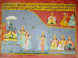 | Description / विवरण | Miniature painting based on Harivansha depicting Krishna sitting on a throne, attended by a chauri bearer, and telling some kings that fighting is the dharma of Kshatriyas. In the left upper corner, a king is punishing a man. |