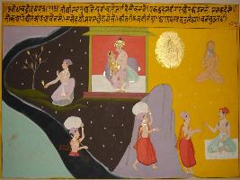 | Description / विवरण | Miniature painting based on Sanskrit drama - Prabodh Chandrodaya depicting a sage, seated in Padmasana, doing penance for Lord Vishnu, on his right a couple in loving union, below them a person crossing the river and then talking to a seated man. |