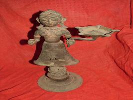 | Description / विवरण | It is a candle stand, shown with a lady shown standing on a round base, its one arm s stand is now, not seen. It is well ornamented. |