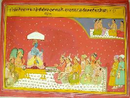 | Description / विवरण | Miniature painting based on Harivansha depicting Krishna sitting in middle on a throne and at left side, Garuda with two other god is sitting and on right side, king s are shown sitting. At the upper left part, Indra is shown sitting with some female. |