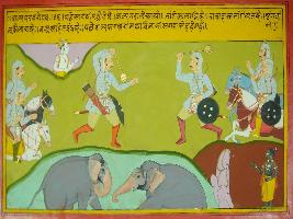 | Description / विवरण | Miniature painting based on Mahabharat - Shalya parva depicting Shalya is fighting with Bhim with mace as if Indra is coming for fight with vajra. |