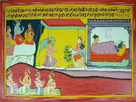 | Description / विवरण | Miniature painting based on Harivansha depicting Shiv sitting with Parvati with Shivganas at top right part. To its left, Krishna is sitting with Balram and eating food and in front of them Garuda is sitting. At the top left Krishna is lying on bed with Balram and One of his Sardar is looking at them. At the lower right part, two Yadav Sardar is shown sitting and talking to each other. |