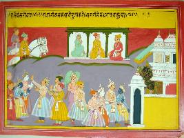 | Description / विवरण | Miniature painting based on Harivansha depicting a king welcoming Krishna and Balram in his city. He is putting a Tilak on their foreheads and entering in his palace. |