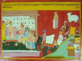 | Description / विवरण | Miniature painting based on Mahabharat - Rajdharma parva. king Yudhisthir was depicted with four brothers sitting in a palace while Draupadi is depicted outside the palace with cow, horse and elephant. |