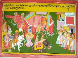 | Description / विवरण | Miniature painting based on Harivansha depicting Krishna seated on Garuda, with Balram and other Yadavs arriving at a city and the king standing, with his nobles, at the city entrance to welcome them. |