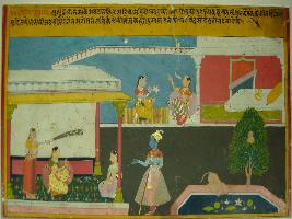 | Description / विवरण | Miniature painting based on Rasikpriya depicting Keshav standing near the Daasvilas Niwas, where Radha is sitting with two friends. On the left a monkey is drinking water from a lotus pond and another is seated on a tree, above it Radha is seated with a friend in the moon lit night. |