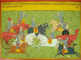 | Description / विवरण | Miniature painting based on Mahabharat - Shalya parva depicting Shalya is fighting with Yudhisthir and Satyaki, Bhim and Nakula are fighting with Kauravas. |