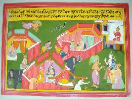 | Description / विवरण | Miniature painting based on Harivansha depicting some battle camps. In the extreme left the city Mathura is partly seen, on the top Garuda is flying after two snakes and in the left lower side Garuda meeting with Balram and Krishna. |