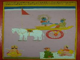 | Description / विवरण | Miniature painting based on Shri Bhagwat Gita. It depicts Krishna preaching Arjun about Rajogun which a king has and through Rajogun one can control himself. |