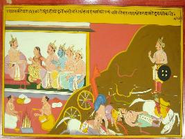 | Description / विवरण | Miniature painting based on Mahabharat - Rajdharma parva. Yudhisthir is depicted telling Draupadi and his brothers that Duryodhan had killed our many soldiers and warriors so we should perform yagna for their sacrifice. |