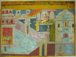 | Description / विवरण | Miniature painting based on Rasikpriya depicting Krishna sitting on the palatial balcony, while Radha is sitting in a separate balcony with her Paricharikas. A female attendant is seen who is carrying the news of Krishna. A sage is seen in the left below corner. |