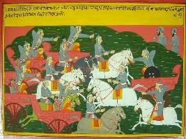 | Description / विवरण | Miniature painting based on Mahabharat - Shalya parva depicting Satyaki, Bhim, Nakula, Sahdev and Yudhisthir together attacking Shalya and Aryavat sage is watching the fight. |
