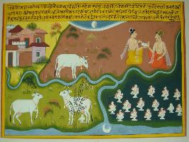 | Description / विवरण | Miniature painting based on Eklinga Mahatmya depicting two seated men at the left lower corner of the painting and in the right, cow Kamdhenu is seen. Below it, Kamdhenu is offering milk on Shiv Linga, in the left a number of Shiv Linga are shown. Moon is seen at the meeting point of two rivers. |