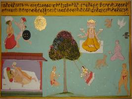 | Description / विवरण | Miniature painting based on Sanskrit drama - Prabodh Chandrodaya depicting Saraswati telling Mana that Lakshmi is movable and can not stay at one place for long time. Seated Brahma, sages, birds and animals are seen in the left part. In lower right corner, a mating of couple is depicted. |