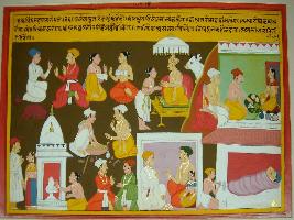 | Description / विवरण | Miniature painting based on Eklinga Mahatmya depicting what would happen in the Kalyug. From the top right- two men are sitting and talking and nearby a goat is lying with head cut off, two sages are selling Veda, a king giving coins in dana, a man taking food before his old parent, a man and woman talking, a man worshipping linga and other people near by are discussing him, a man selling his daughter. a thief robbing with the owner sleeping inside. |