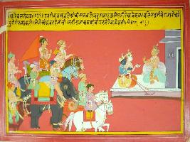| Description / विवरण | Miniature painting based on Harivansha depicting Krishna and Balram sitting and talking to Ugrasena. Behind them their companions, sitting on horse back, on chariots and on elephants are depicted. |