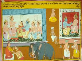 | Description / विवरण | Miniature painting based on Mahabharat - Rajdharma parva depicting Draupadi with the Pandavas. God Indra also is depicted, Arjun is depicted with Yudhisthir and on the lower part two elephant two women and two men are depicted. |
