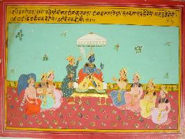 | Description / विवरण | Miniature painting based on Harivansha depicting Krishna sitting in middle and on his two side, courtesan, god and his Garuda is shown sitting. |