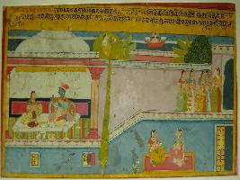 | Description / विवरण | Miniature painting based on Rasikpriya depicting Nayak Nayika seated together in the palace in the right side of the painting. On the left upper corner few women with Nayika, below it two seated women are depicted. Painting depicts the story, Srikrisan Ko Bhukibo. |