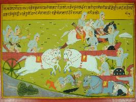 | Description / विवरण | Miniature painting based on Mahabharat - Shalya parva depicting a war scene. Nakul is depicted fighting with Kauravas and Duryodhan and Shalya is fighting with Nakul. |