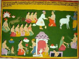 | Description / विवरण | Miniature painting based on Eklinga Mahatmya depicting a seated man with lotus flowers, a crocodile and a tortoise, seven seated men, a king giving dana, and Krishna talking to a cow. In the lower part, a man is offering Ahuti in the fire, a man is having meal while an attendant is fanning him, a man is worshipping Shiv linga, and a couple is having meals. |