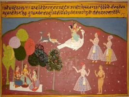| Description / विवरण | Miniature painting based on Sanskrit drama - Prabodh Chandrodaya depicting comparison between Mana and a deer. Mana is responsible for diversion of a man towards Vairagya. Saraswati seated on bird is depicted in the upper part. |