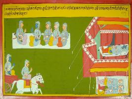 | Description / विवरण | Miniature painting based on Mahabharat - Shalya parva. The painting depicts that Yudhisthir is talking with his brothers and on the other hand the Pandavas are taking rest. |