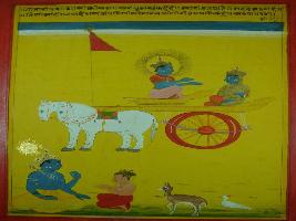 | Description / विवरण | Miniature painting based on Shri Bhagwat Gita. It depicts Krishna preaching Arjun, he gets birth from Brahma and all creatures are born from me. |