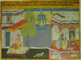 | Description / विवरण | Miniature painting based on Rasikpriya depicting Nayika sitting outside the palace on a couch. On the right part, a cat is shown in lower middle. At the left side, Krishna is shown sitting with a woman and talking in a palace. |