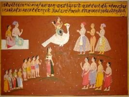 | Description / विवरण | Miniature painting based on Sanskrit drama - Prabodh Chandrodaya depicting Saraswati telling about mana heart and Vairagya, who are standing before her. Near them, a seated couple, a woman, many sons and daughters and sages are depicted. |